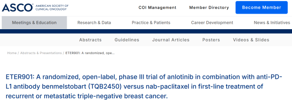 [5]Jiayu Wang,Binghe Xu,et al.ETER901: A randomized, open-label, phase Ⅲ trial of Anlotinib in combination with anti-PD-L1 antibody Benmelstobart (TQB2450) versus nab-paclitaxel in first-line treatment of recurrent or metastatic triple-negative breast cancer.2025 ASCO(#1104).