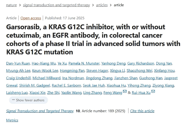 [1] Ruan, DY., Wu, HX., Xu, Y. et al. Garsorasib, a KRAS G12C inhibitor, with or without cetuximab, an EGFR antibody, in colorectal cancer cohorts of a phase II trial in advanced solid tumors with KRAS G12C mutation. Sig Transduct Target Ther 10, 189 (2025). http://doi.org/10.1038/s41392-025-02274-z